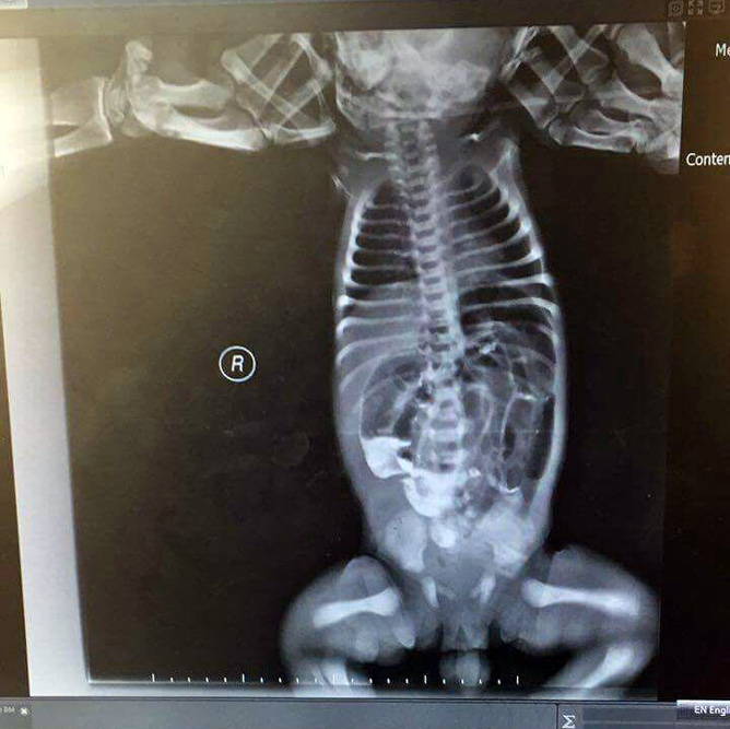 Doğulduğundan bəri normal nəcis çıxışı olmayan, qarnında ciddi gərginlik ,köp olan 3 günlük körpəyə aparılan müayinələr nəticəsində Mekonial bağırsaq keçməzliyi "Kistik fibrozis" yəni anadangəlmə irsi xəstəlik nəticəsində ilk nəcisi çıxarmama diaqnozu qoyularaq təcili əməliyyata alındı.