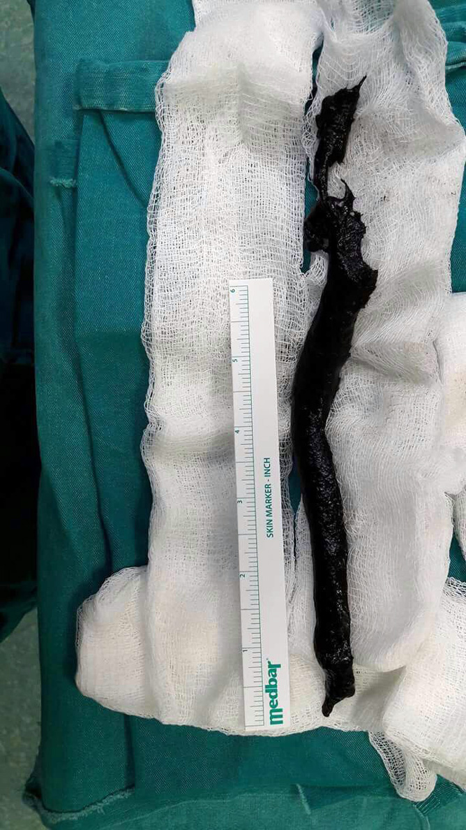 Nazik bağırsağın divarı kəsilərək içəridə yığılıb qalan ilk qatı nəcis kütlələri təmizləndi.