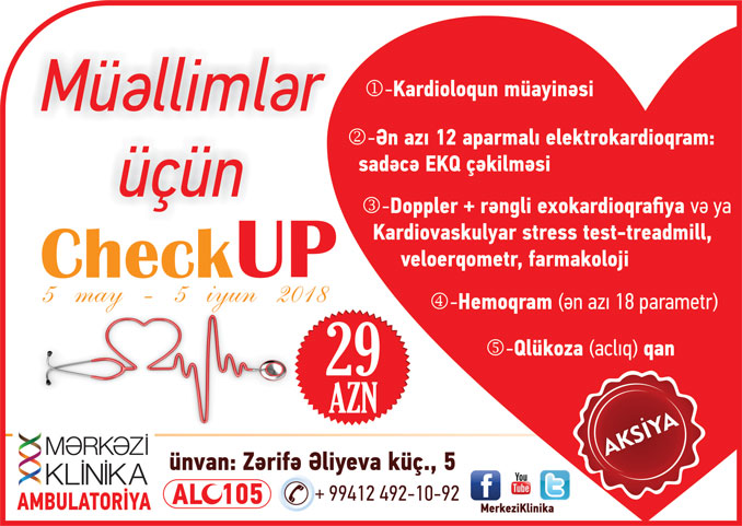 5 May - 5 İyun tarixləri arasında Mərkəzi Klinika Ambulatoriyada müəllimlər üçün Check Up cəmi 29 AZN.