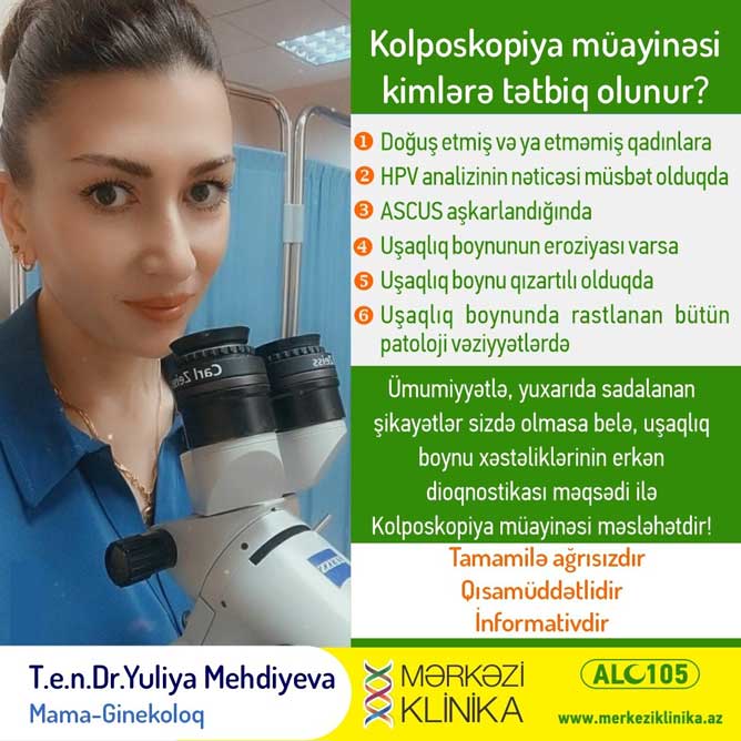 Ümumiyyətlə, yuxarıda sadalanan şikayətlər sizdə olmasa belə, uşaqlıq boynu xəstəliklərinin erkən dioqnostikası məqsədi ilə Kolposkopiya müayinəsi məsləhətdir!