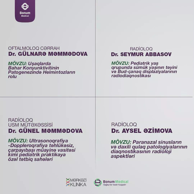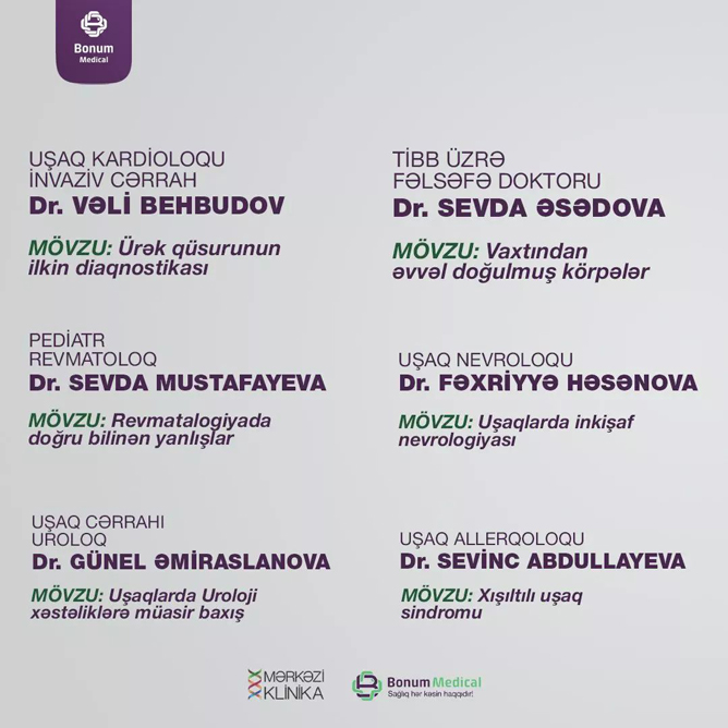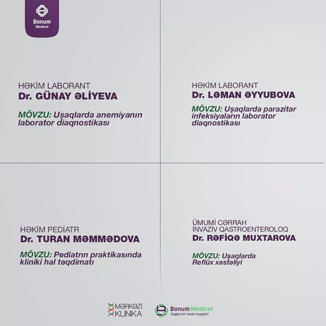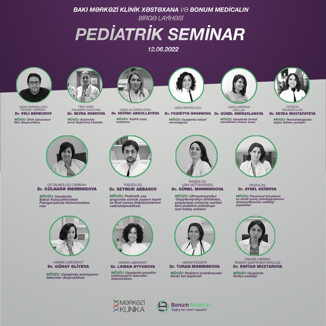 Bakı Mərkəzi Kliniki Xəstəxana və Bonum Medicalda (Şəki şəhəri) birgə lahiyyəsi olaraq 12 Iyun tarixində Pediatrik seminar baş tutacaq. Seminarda pediatrik diaqnostika və müalicə sahələrinin aktual məsələləri müzakirə olunacaq, təcrübə mübadiləsi həyata keçiriləcək. Artıq 1 ilə yaxın müddətdir ki Bakı Mərkəzi Kliniki xəstəxana ilə Bonum Medikalın əməkdaşlığı müxtəlif sahələrdə uğurla davam edir. Mütəmadi olaraq Pediatrik kardiologiya, pediatrik nevrologiya, pediatrik uro-cərrahiyyə sahələri üzrə Bakı Mərkəzi Klinik Xəstəxananın təcrübəli və ixtisaslaşmış mütəxəssisləri Bonum Medical klinikasına dəvət olunur, pasientlərə uyğun sahələrdə xidmət göstərirlər. Bu yerli pediatrlar üçün də böyük üstünlük təmın edir, onların pasientlərinin ehtiyacı olduqda dar-ixtisaslaşmış sahənin mütəxəssisləri ilə konsultasiyası, bilgi mübadiləsi, müalicənin birlikdə təşkilini təmin edilir.