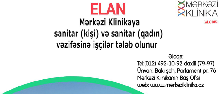 Mərkəzi Klinikaya sanitar (kişi) və sanitar (qadın) vəzifəsinə işçilər tələb olunur. Əlaqə üçün: 012 492 10 92 daxili kod (79-97)