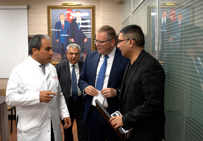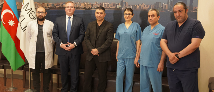 Mərkəzi Klinikanın Baş Direktoru Həsən Qəndilov qonağı kollektivə təqdim etmişdir. Prof. Dr. Kamran Musayevin rəhbərliyi altında çalışan komandanın işləri ilə tanış olan qonağımız Mərkəzi Klinikadakı Ürək-damar cərrahiyyəsi şöbəsinin fəaliyyəti ilə də yaxından tanış olmuş və mayın 1-də Mərkəzi Klinikada icra edilən ürək əməliyyatlarında da iştirak etmişdir.