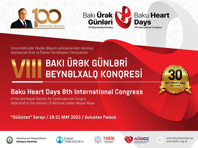 Azərbaycan Ürək və Damar Cərrahiyyəsi Cəmiyyəti (AÜDCC) 19-21 may 2023-cü il tarixlərdə "Gülüstan" sarayında Ümummilli Lider Heydər Əliyevin 100 illiyinə həsr olunmuş “Bakı Ürək Günləri” 8-ci Beynəlxalq Konqresini təşkil edəcək.