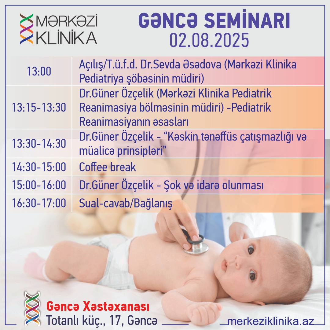 02.08.2025-ci il tarixində Mərkəzi Klinika Gəncə Xəstəxanasında Qərb Regionunun pediatrları və bu sahənin mütəxəssislərinin iştiraki ilə seminar keçirilməsi planlaşdırılır. Seminarda Mərkəzi Klinikanın Bakı Xəstəxanasının Uşaq Reanimasiyası və İntensiv terapiya şöbəsinin məsul şəxsi, bu sahədə ixtisaslaşmış və təcrübəli mütəxəssis Dr.Güner Özçelikin iştirakı və müzakirələri planlaşdırılır. İştirak etmək istiyənlər +994507455094 müraciət edə bilərlər.